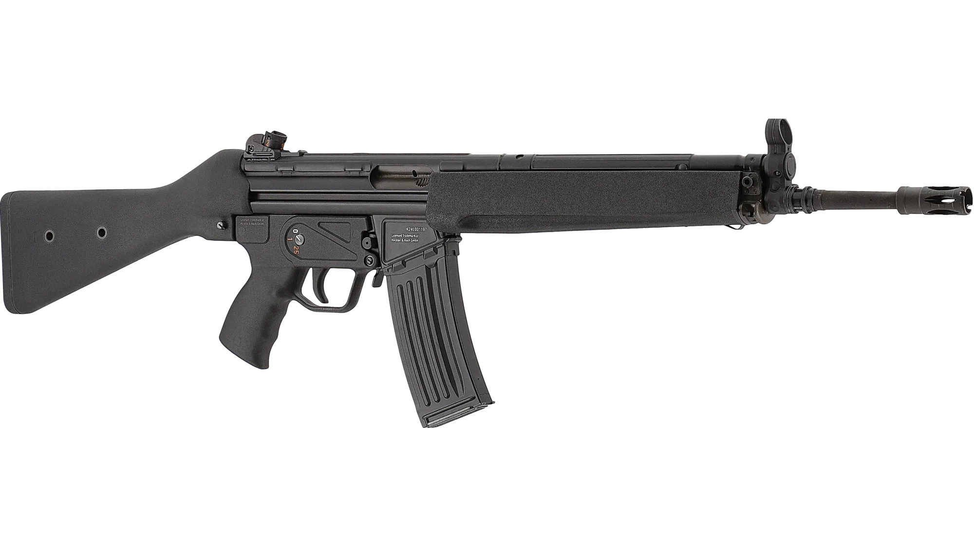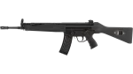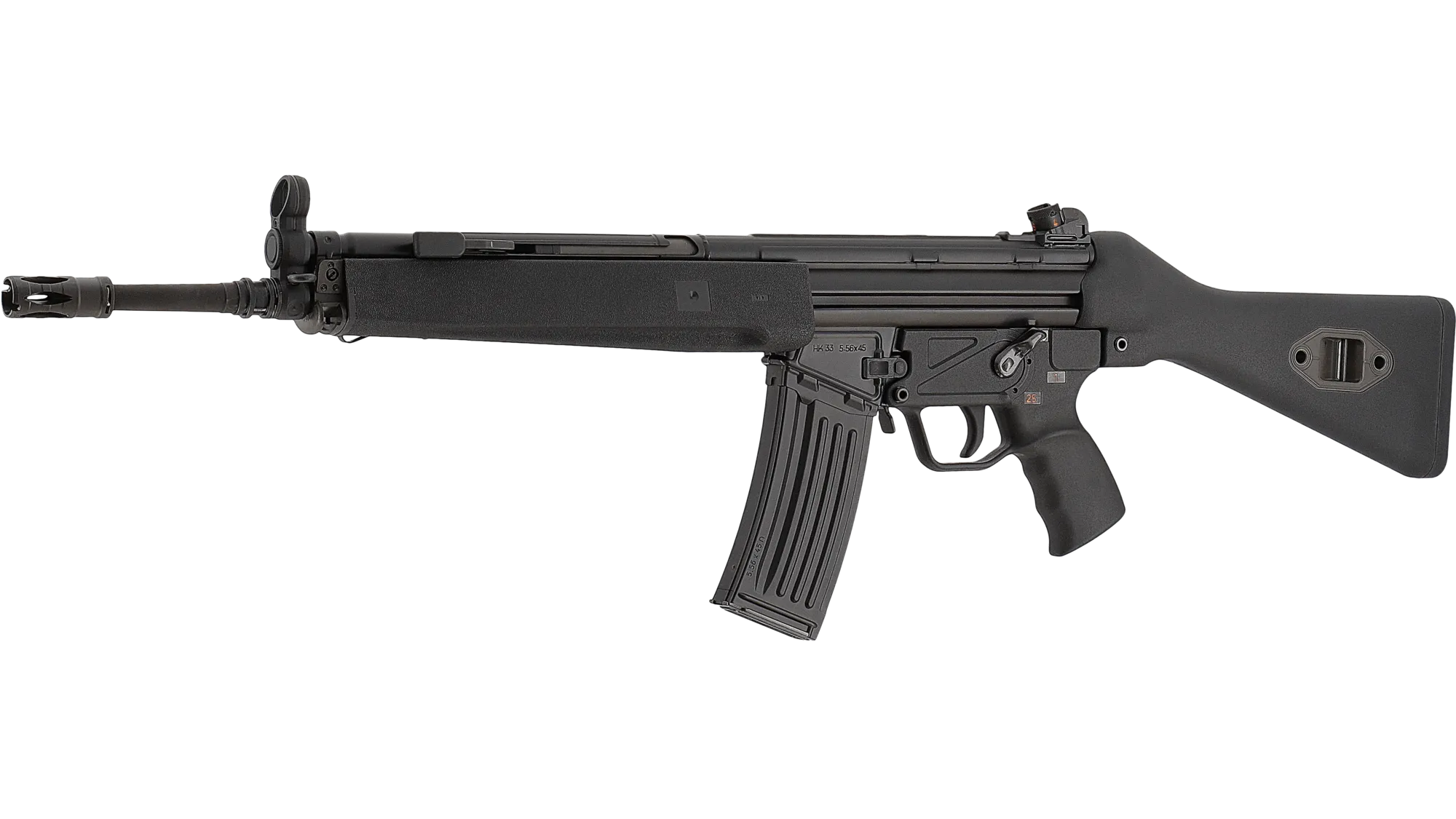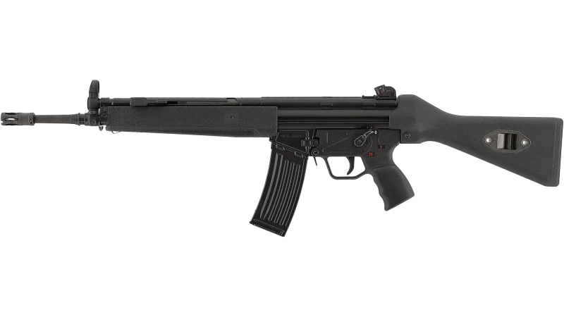La HK33 en calibre 6 mm BB est une réplique airsoft à gaz inspirée du fusil conçu par H&K à partir du G3, adapté au calibre .223. Son format légèrement réduit, associé à une crosse fixe et au système à retard par galets, reprend fidèlement l’ergonomie et le design du modèle d’origine.